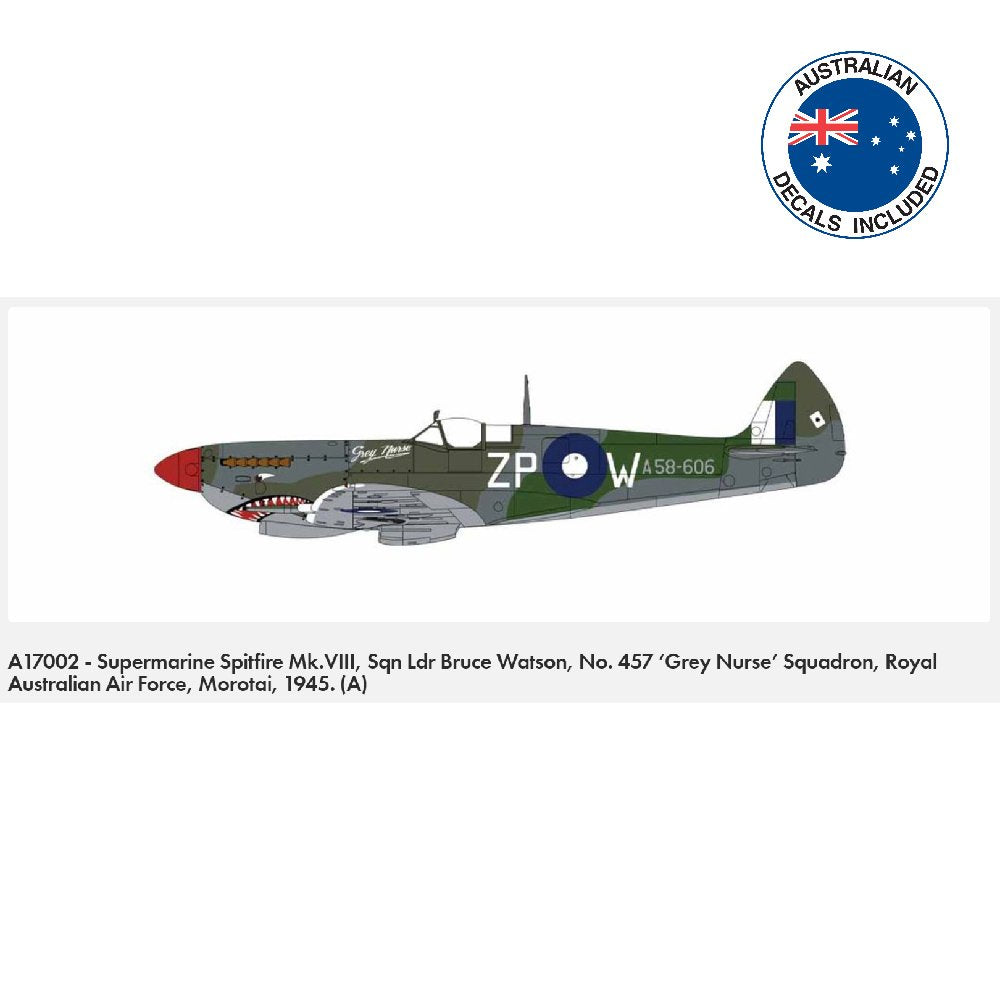 No. 457 Squadron Royal Australian Air Force became known as Grey Nurse Squadron after repainting their newly arrived Spitfire Mk.VIIIs with distinctive shark mouths. Originally tasked with the air defence of Darwin, the squadron was soon moved northwards to Morotai and eventually Labuan to primarily conduct ground attack missions against the Japanese forces. The aircraft portrayed is that of 457s commanding officer, Sqn. Ldr. Bruce Watson DFC.