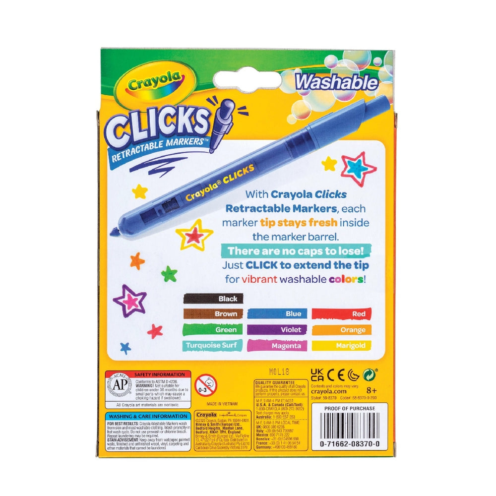 No more lost caps or dried out markers! Crayola Clicks Washable Markers are retractable with special ink that is designed to resist drying out. Their conical tips make it possible to create thick and thin lines, while the easy-click design makes them ideal for coloring on-the-go! Prepare for school projects, crafts, and homework assignments with vibrant colors that wash from skin as well as most washable clothing. Pair this marker set with giant coloring pages or activity books (sold separately) for hours of colorful, creative fun! This set comes with 10 classic colors, ideal for a variety of creative projects.