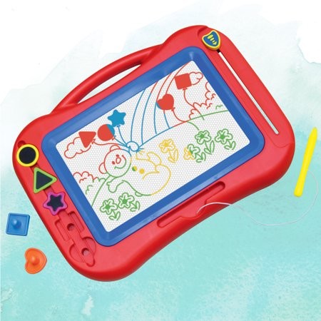 With 5 stamp shapes and an attached stylus pen, your child can create all sorts of colorful and imaginative scenes, play a game of tic-tac-toe, practice their ABCs and more without any messy supplies. And, when they're done creating one masterpiece, they simply slide the eraser down the side to magically clear the board and start again! A large handle at the top makes it great for on-the-go fun!