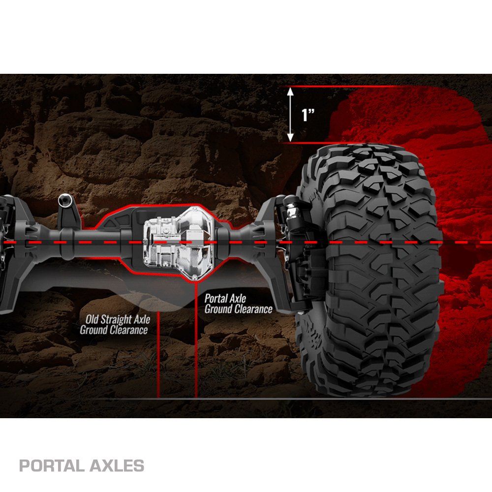 - The Power of Portals: Portal axles lift the truck at the wheels for huge center pumpkin ground clearance. To achieve the same clearance with straight axles, the tyres would have to be over an inch taller than the tyres on TRX-4 Pathfinder.