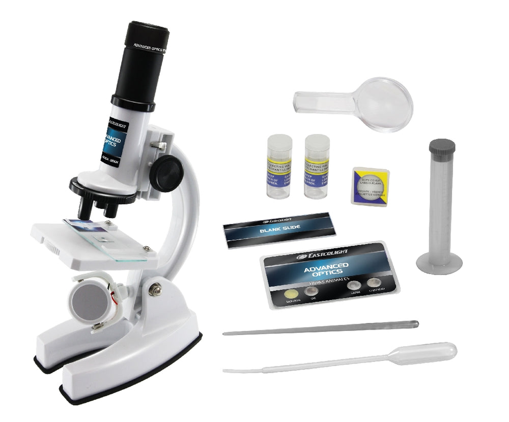 Check out life under the microscope with this Deluxe Microscope set - complete with carrying case! Accessories: 1 Microscope 1 Advanced Optics® Data Bank 1 3X Magnifier 1 Prepared Slide 1 Blank Slide 14 Blank Labels 12 Cover Glasses 12 Slide Covers 2 Collecting Vials 1 Stirring Rod 1 Plastic Cylinder 1 Pipette 1 Dissecting Needle Including Operating Instructions Technical Specifications: MAGNIFICATIONS: 200X / 600X / 1200X LIGHT SOURCE: WHITE LED, MIRROR BATTERIES REQUIRED: 2AA/LR6 (NOT INCLUDED)