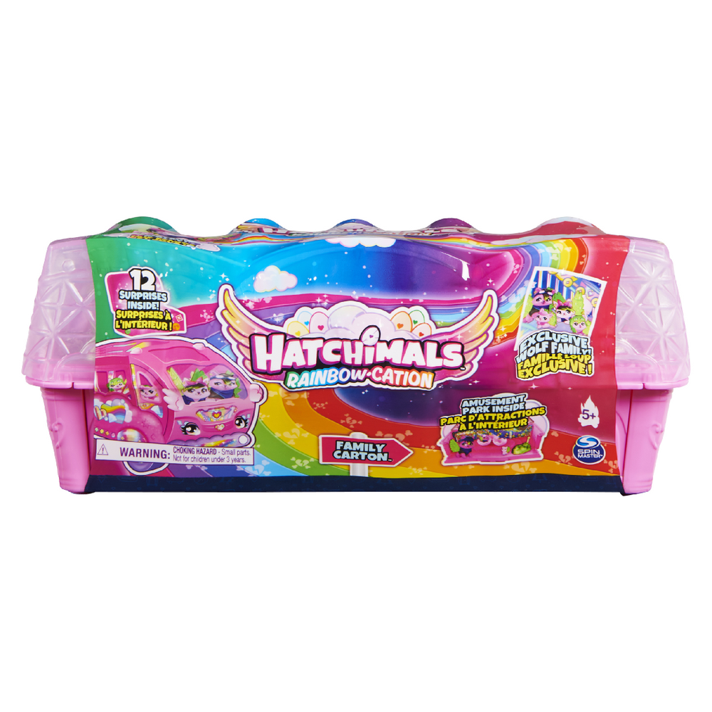 Exciting amusement park adventures await with the Llama Florists and the Hatchimals CollEGGtibles Family Carton! Each Rainbow-cation Hatchimals Family has their own unique look and theme inspired by their favorite vacation activities. Discover nine new families, including the Wolf Bikers, Koala Campers, Llama Florists, Luau Leopards, Sparkling Poodles, Cat Dancers, Dog Pilots, rare Ice Skating Penguins and super rare Unicorn Hair Stylists – they’re all so cute! This beautifully detailed Hatchimals egg carton is packed with surprises: 10 wolf characters on a Rainbow-cation, two play accessories, and a secret theme park playset inside! Open the carton to discover five Hatchimals eggs, two Parents, one Big Kid and the accessories. Crack the surprise eggs open to find the rest of the Family Carton’s characters – three Little Kids and four sweet wolf Babies! After hatching your new friends, lift the Family Carton’s lid to reveal the playset. Fold the front of the carton down, set up the themed backdrop and have the ultimate day out at the Hatchimals amusement park! Attach the egg bases onto the playset and place your characters inside to make an egg ride that you can spin! Plus, use the cotton candy cart and unicorn carousel accessories to add to your pretend play storytelling. It’s so much fun! Display your family inside the carton or close it up and take the Wolf Bikers with you anywhere you go! With over 60 new Rainbow-cation Hatchimals to collect (girls toys each sold separately), complete all nine Hatchimals Families! Hatchimals CollEGGtibles surprise toys for girls are perfect for kids who enjoy cute collectibles, action figures, dolls, and small toys. They make great birthday gifts for kids, Christmas gifts, stocking stuffers, Easter basket stuffers and more! Experience family fun at the amusement park with the Wolf Bikers and the Hatchimals CollEGGtibles Family Carton!