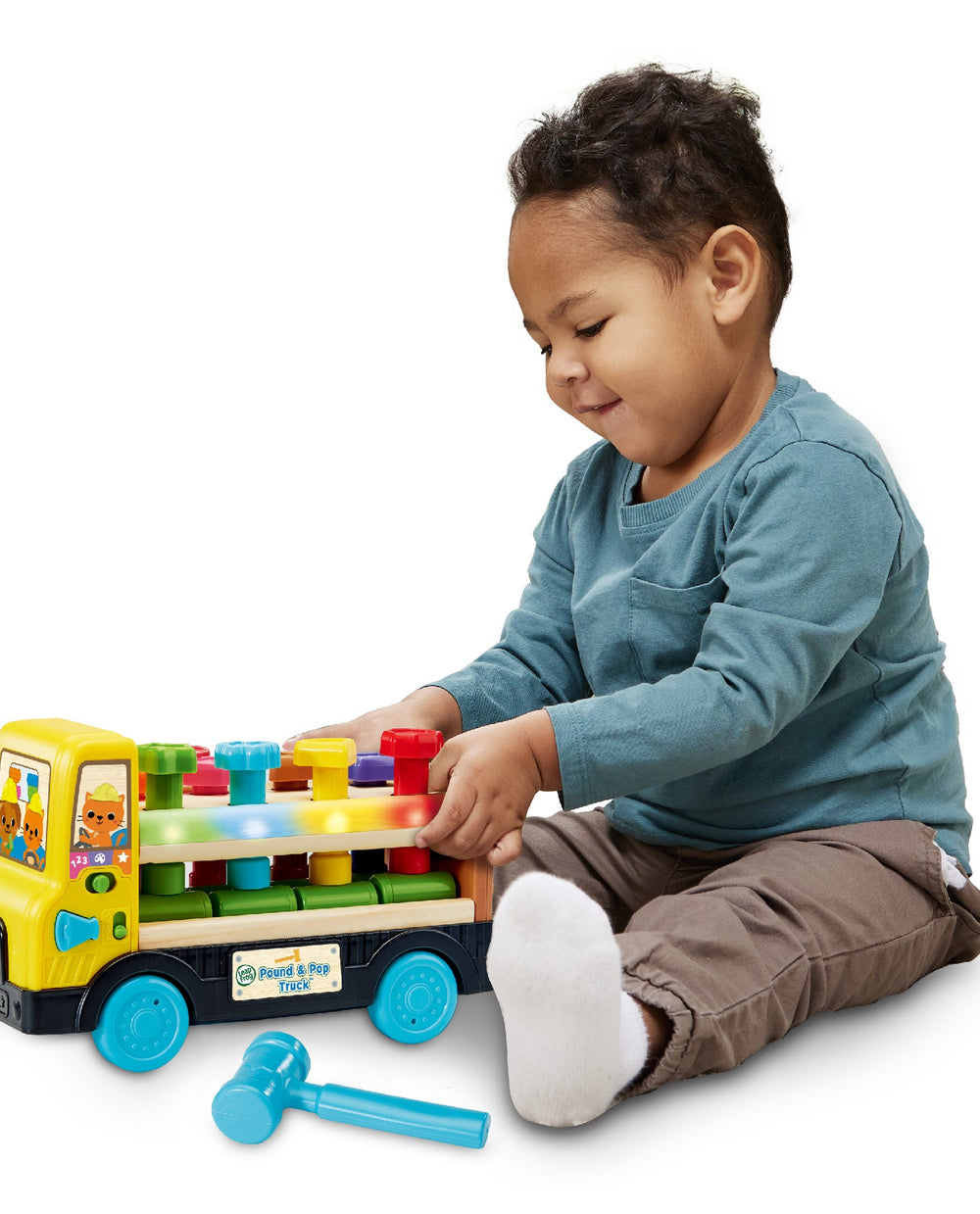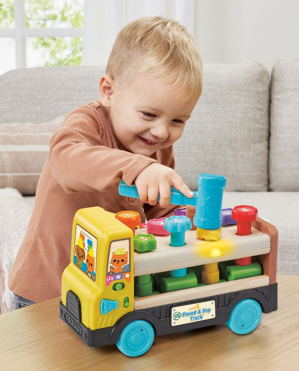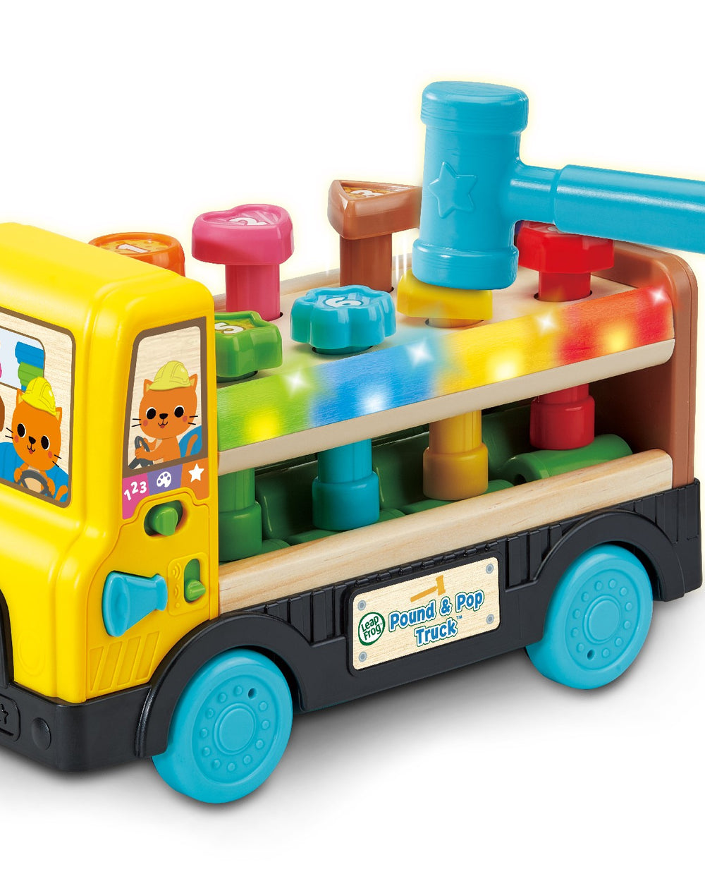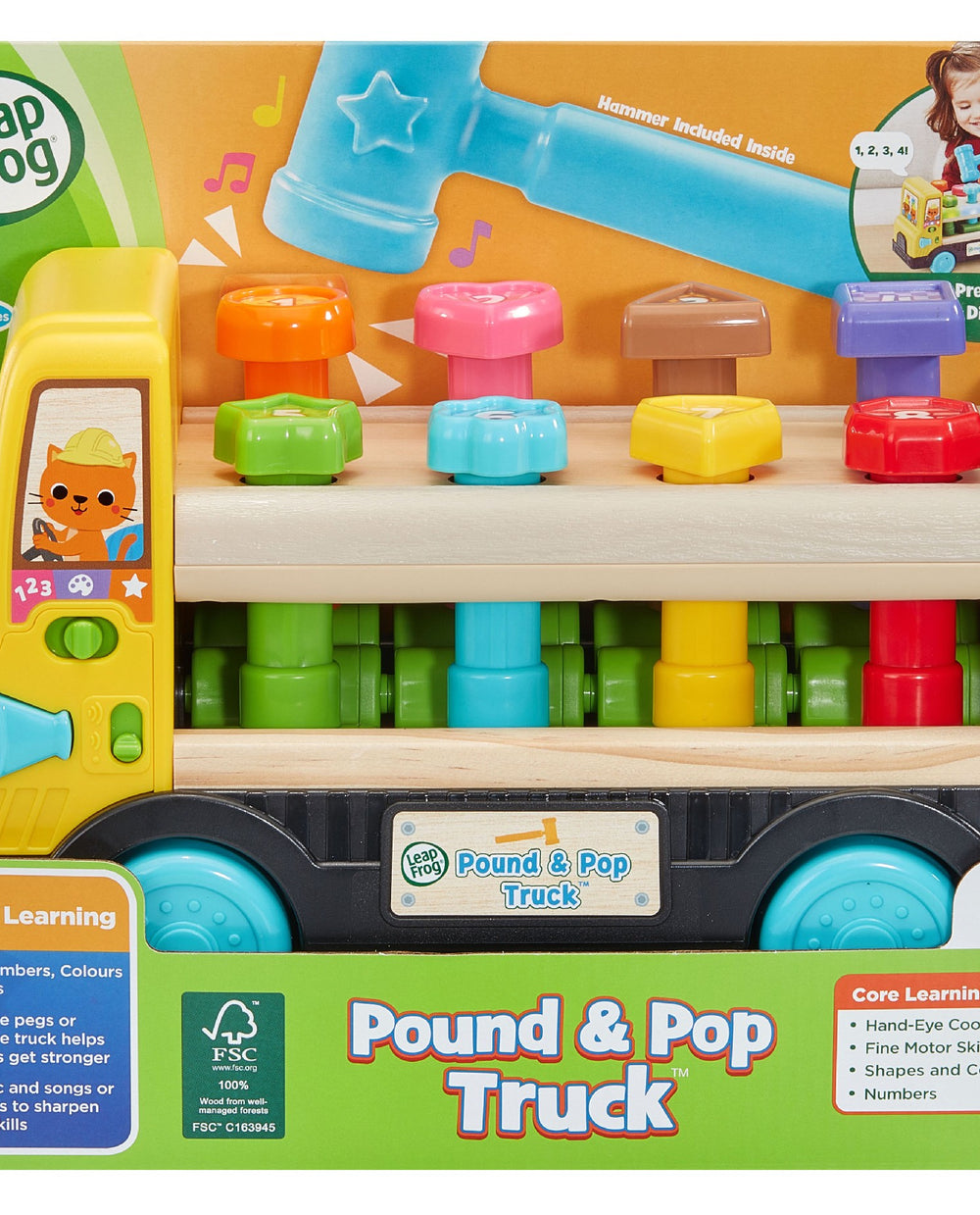 The Pound & Pop Truck Is Sure To Be A Hit With Little Learners! This Truck Features Classic Vehicle And Pounding Play With 3 Fun Modes Of Play And Role Play Scenarios To Make Learning Fun! Using The Hammer, Kids Can Explore Colours, Numbers And Shapes. In Colour Mode Pound The Peg To Learn Different Colours And Watch As The Side Of The Truck Lights Up Reinforcing Colour Learning. Hank The Hound Is On Hand In Shape Mode To Encourage Shape Learning. Listen To The Shape Called Out, Find The Shape On The Peg And Pound That Peg! Learn Numbers By Listening To Different Pretend Role Play Scenarios. Goat Wants A Circle, Can You Pound The Circle? When Pounding The Pegs Kids Develop Hand Eye Coordination As Well As Learn All About Cause And Effect. Let’S Hit The Road And Nail Learning!