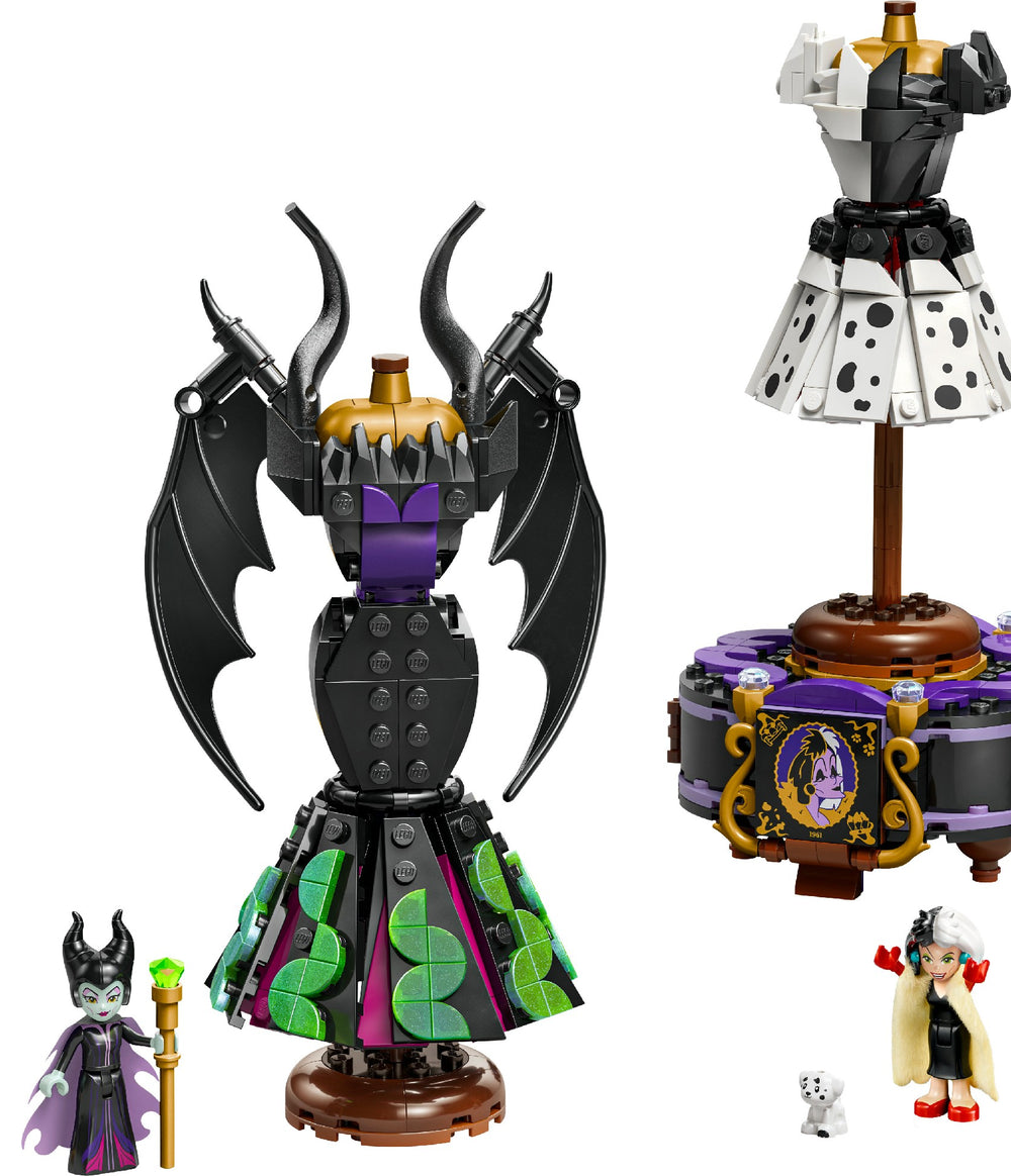 - Fun building toy – 2 buildable dresses, 2 dressstands and a display stand with space for the Maleficent and Cruella De Vil LEGO® Ç€ Disney minidoll characters and 2 LEGO Ç€ Disney animal characters