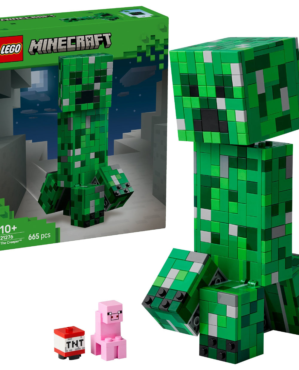 LEGO® Minecraft® The Creeper™ (21276) is a large, posable action figure for kids to build, play with and put on display for all to admire. This iconic piece of gaming-room decor makes an ideal birthday, Christmas or any-day gift for kids aged 10 and over with a passion for Minecraft. This buildable toy recreation of Minecraft’s iconic Creeper stands over 21 cm (8 in.) tall. It has 4 movable legs and a posable head that moves from side to side and tilts up and down. The front of the LEGO Minecraft Creeper figure’s head detaches to reveal an interior space containing a first-version Creeper and a TNT element. For added digital fun, builders can use the intuitive LEGO Builder app to zoom in, rotate models in 3D and track their progress. Contains 665 pieces.