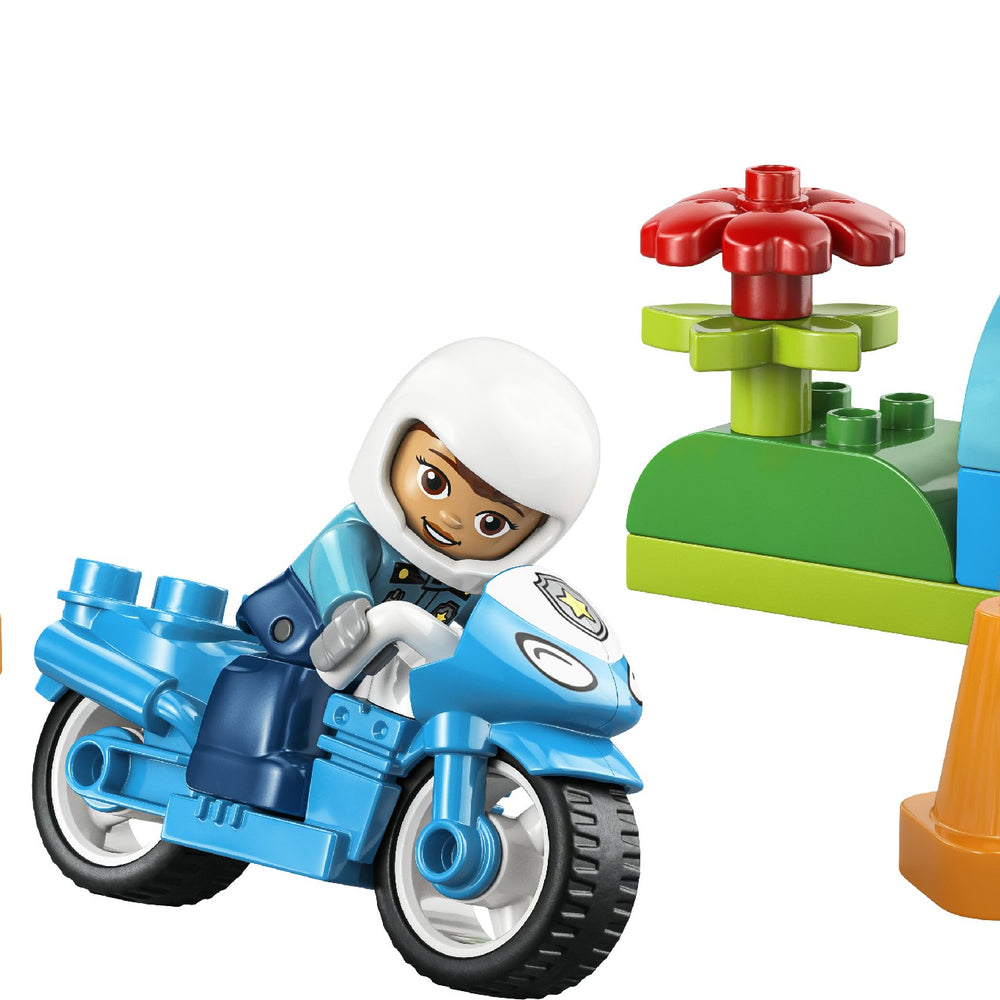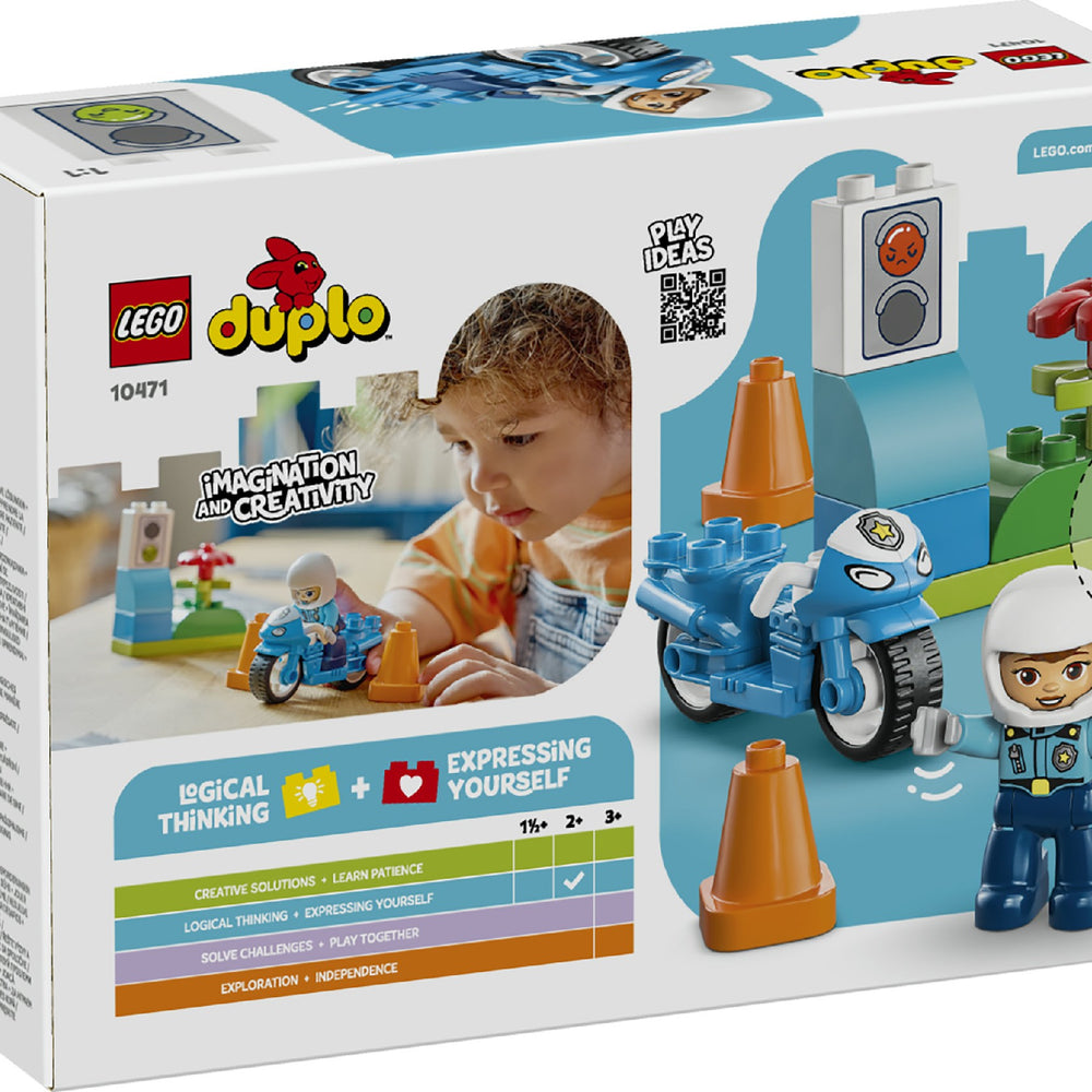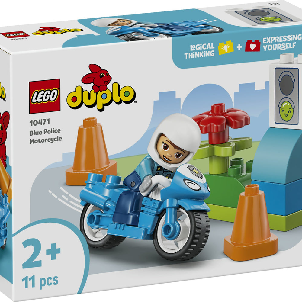 Bring fast fun to the playtimes of kids aged 2+ with the LEGO® DUPLO® Town Blue Police Motorcycle (10471) playset. This learning toy lets toddlers pretend-play community-helper stories as the police officer sets off to patrol the roads on her cool LEGO DUPLO motorcycle. A great birthday gift or just-because treat for 2-year-olds and over who love emergency vehicle toys, this small gift for young kids includes a police figure, toy traffic light decorated brick and 2 cones. With their big colourful toy bricks, fun narratives and diverse characters, LEGO DUPLO sets are designed to engage toddlers’ natural curiosity to help them reach their developmental milestones. This educational toy gets them practising their fine motor skills as they place the LEGO DUPLO police officer on the toy motorbike and drive her around the cones. With the traffic lights toy, parents can teach their little road users that red means stop and green means go, go, go! Contains 11 pieces.