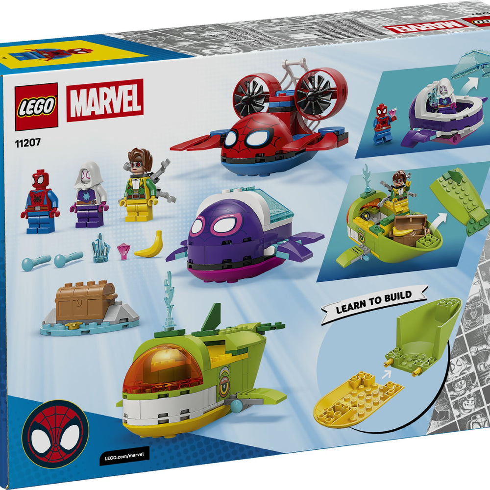 Zoom into pretend-play adventures with Spidey: Underwater Vehicles (11207), a building set for boys, girls and LEGO® Ç€ Marvel fans aged 4 years old and over. With Spidey, Ghost-Spider and Doc Ock minifigures and 3 submarines, this build-and-play Spidey playset is a great way to develop kids’ creative skills. The building toy features 3 vehicles: Spidey’s crab submarine with a large web trap; Ghost-Spider’s turtle submarine with an opening transparent shell; and Doc Ock’s whale submarine with shooters on the fins and storage space for the treasure chest. Spidey: Underwater Vehicles makes a great birthday gift for fans of the Spidey And His Amazing Friends show. Designed with budding builders in mind, it includes colourful pictorial instructions, large Starter Bricks and separate bags containing 1 buildable model per bag to make construction fast and fun. With the LEGO Builder app, kids can zoom, rotate in 3D and track progress with easy-to-follow digital instructions. Contains 154 pieces.
