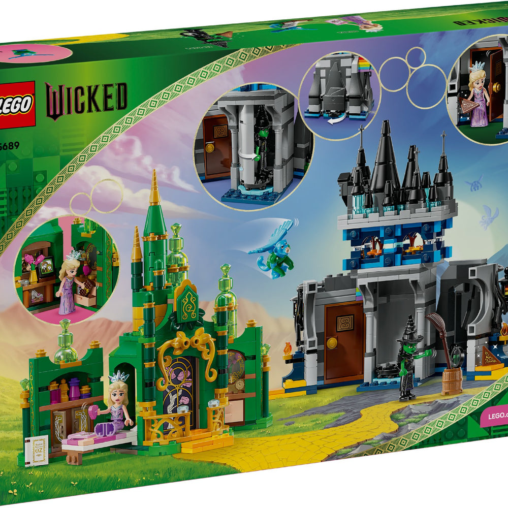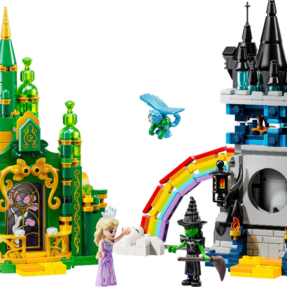 • LEGO® Wicked adventure gift – Emerald City & Kiamo Ko Castle playset includes 2 building toys with LEGO Wicked Elphaba and Glinda minidolls, a flying monkey figure and a buildable rainbow