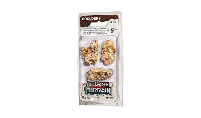 All Game Terrain Random Boulders Random Boulders are highly detailed and authentically weathered to create realism. They are ready to place right out of the package and onto your battlefield. Surface Rocks have a smooth surface to use as a base for your miniatures or as a statement piece on your gaming mat. 4 PC. Scenic materials from All Game Terrain.