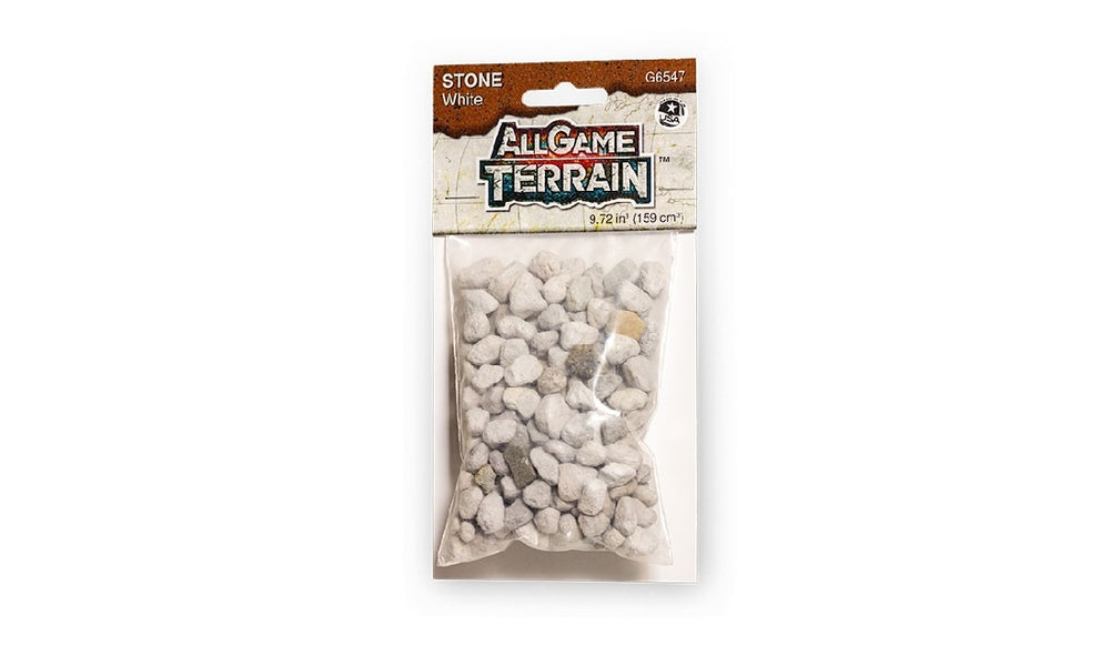 All Game Terrain White Stone White Stone represents medium to large sized rocks on your miniature base or gaming mat while showing scale for your miniatures. White Stone can be used for stream beds, caves and mountains. Blend multiple colours and sizes of rocks together to create variation on your terrain feature. 9.72 in³ (159 cm³). Scenic materials from All Game Terrain. Glue White Stone down easily with Game Tac ™. (Not included. Available separately).