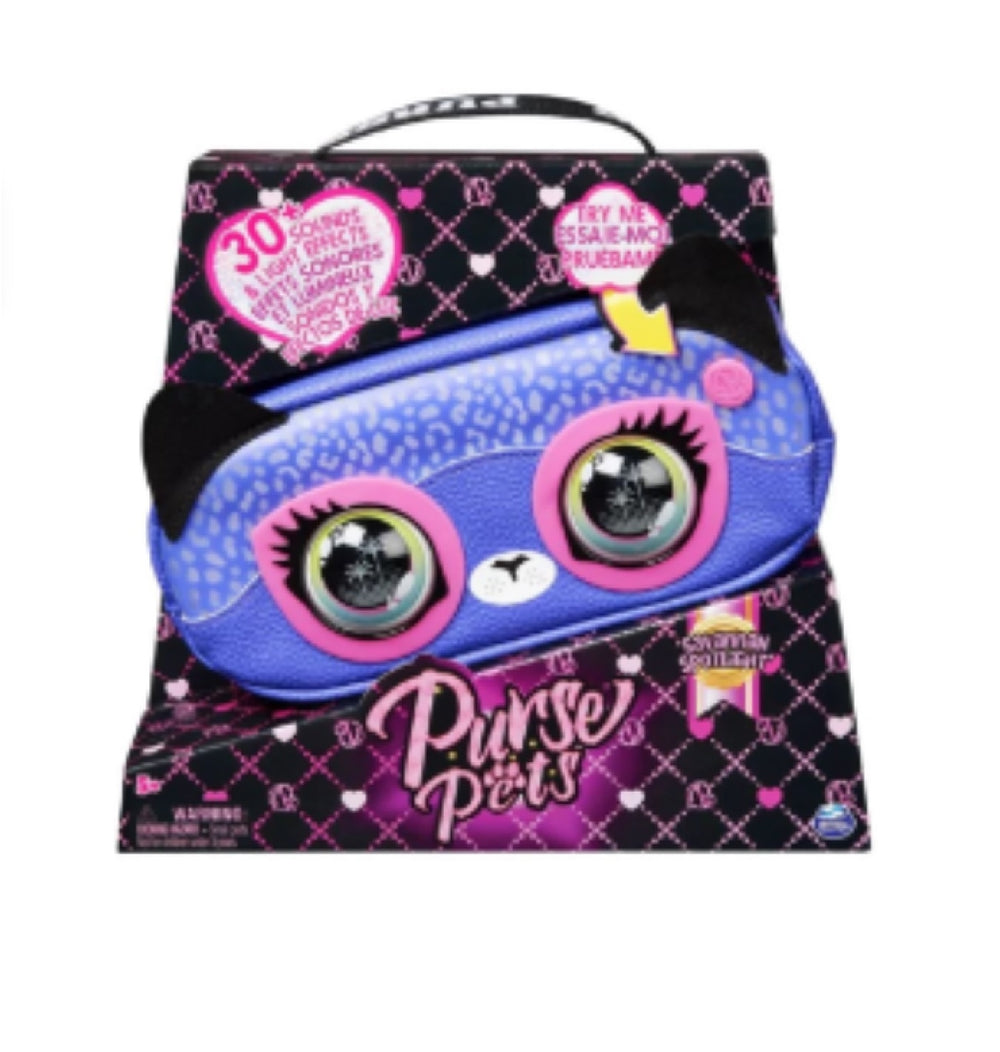 Light up your look with the Purse Pets Savannah Spotlight belt bag! This fabulous and functional interactive Purse Pets girls purse is packed with stylish features. She responds to your touch, has multicolor light-up cheetah spots and over 30 exciting sounds and light effects! Savannah Spotlight features beautiful details including pebbled faux leather accents, amped up expressive eyes, a metal zipper, and an adjustable printed Purse Pets strap to wear your way.