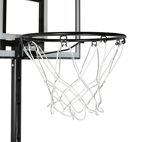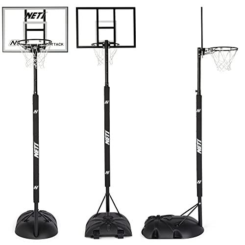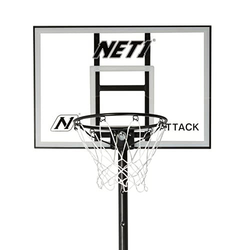 The NET1 Attack Basketball Hoop is perfect for youth practice and games and features a telescopic pole height adjustment that does not need the use of tools. It features a 76 x 51cm Pro-look polycarbonate backboard with 'H' frame support and a 38cm solid steel hoop which is for use with basketballs size 5 and under. A compression sprung goal and an all-weather 9-loop net top the 5cm diameter powder coated round 2 piece pole. The goal height adjusts in seconds from 2.0m up to 2.6m (6'5" to 8’5") and the pole comes with a protective pole pad. The 38 litre blow moulded portable base can be filled with either sand or water. If using water, be sure to add antifreeze in colder conditions to avoid the base cracking. Two wheels fitted to the rear of the base allow for easy transportation. There is also provision for 4 ground anchor stakes (not included). Features: - 76 x 51cm Pro-look polycarbonate backboard with 'H' frame support - 38cm solid steel goal - 5cm diameter powder coated round 2 piece pole. - Adjusts goal height in seconds from 2.0m up to 2.6m (6'5" to 8'5"). Protective pole pad included - 38 litre blow moulded portable base. Fills with either sand or water..Compression sprung goal,All weather 9 loop net.Telescopic pole height adjustment without the use of tools...Provision for 4 ground anchor stakes (stakes not included).Two wheels fitted to rear of base for easy transportation,,