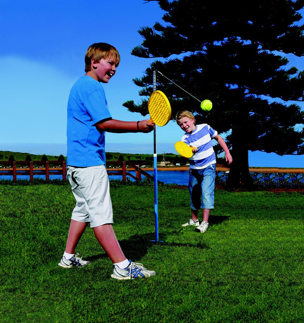 Fast 2 player bat and tethered ball game for the whole family. Orbit Tennis includes in ground powder coated base pole and chrome plated top pole. 2 styles of game play. Swivel rotates freely for fast exciting play. Spring enables scoring and game variation. Complete with 2 strong polypropylene bats with wrist straps and top quality Orbit Tennis Ball with nylon cord and swivel assembly. Supplied in a heavy duty zip-up bag for easy storage.Suitable for age 8 yrs+ Box Size: 100 x 20 x 6.5 cm