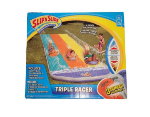 The Original Backyard water slide with three lanes, it's a race to the finish! Kids will have hours of fun. 4.8m long with 3 lanes and 3 boogie boards. Ages 5-12