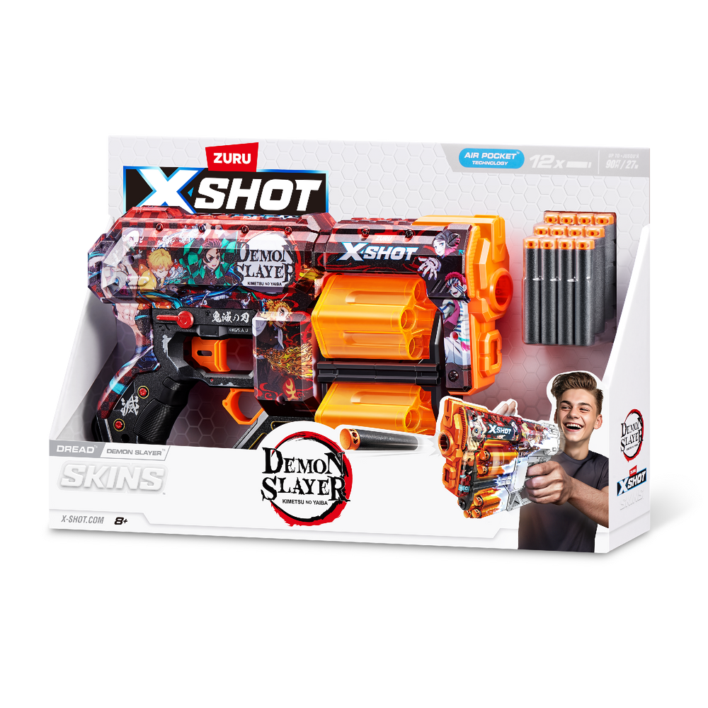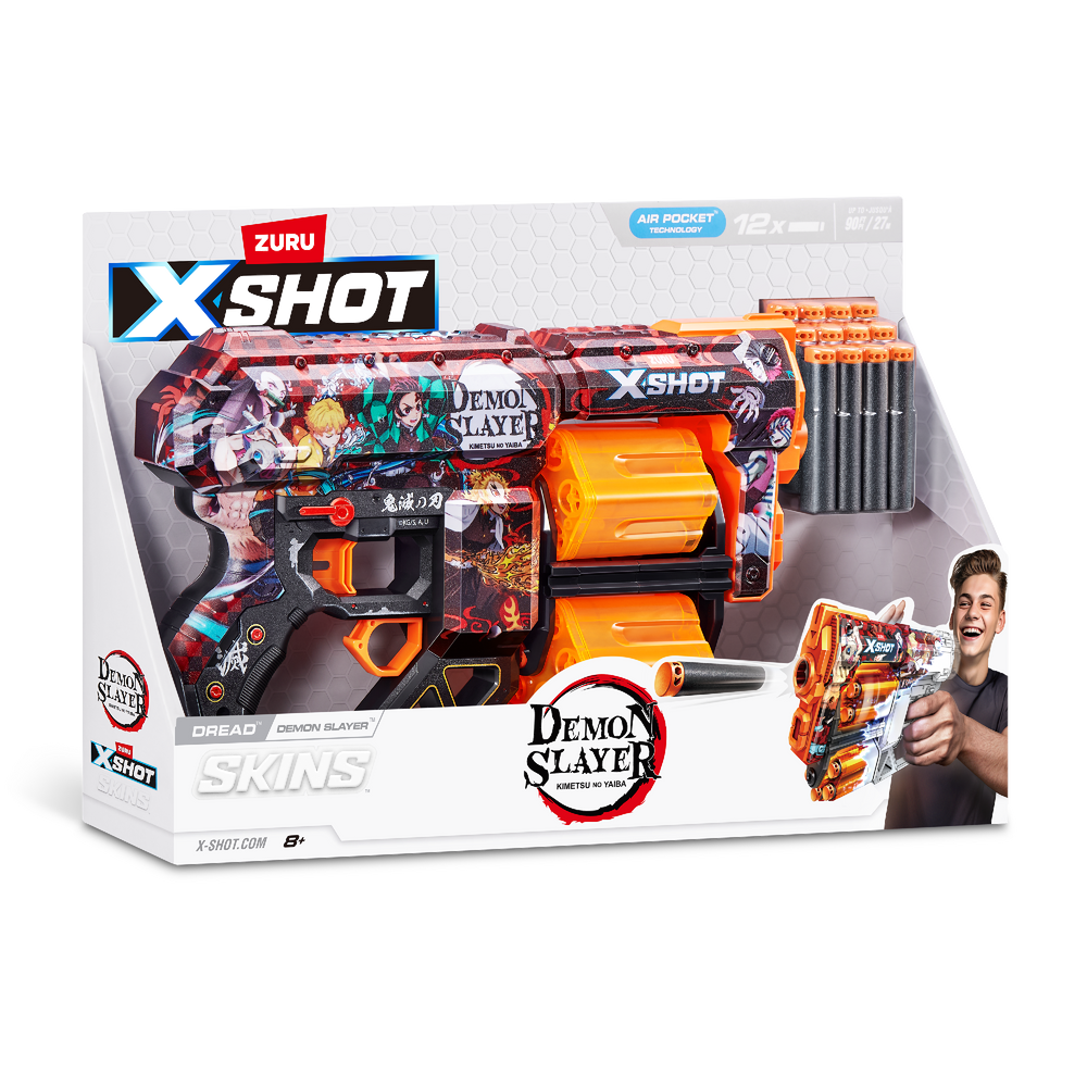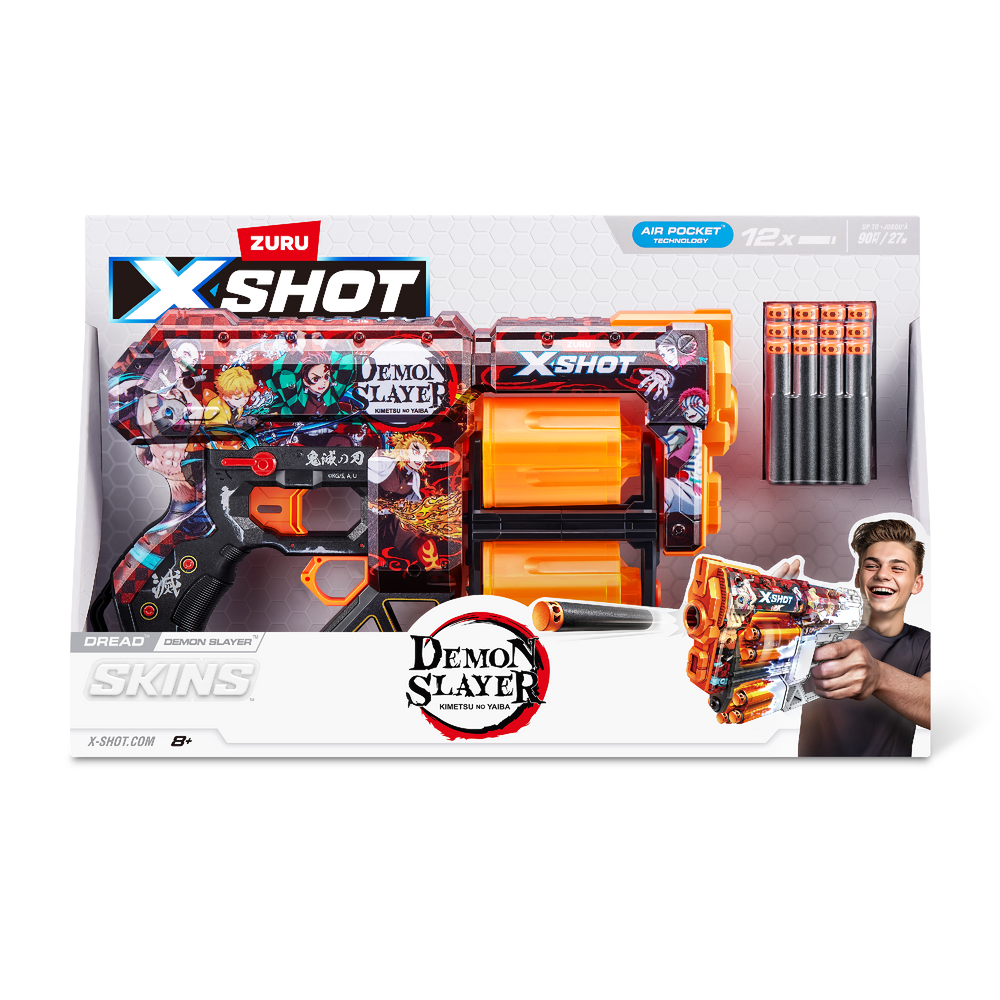 XSHOT Skins brings the in-game experience of skinning your blaster into the real world, choose your Skin and join the battle. With a 12-dart capacity, the Demon Slayer Dreads"™ double trouble rotating barrels mean you are locked and loaded for fun and can blast the competition from up to 27m / 90 feet away. The XSHOT Skins Dread blaster comes in 7 unique skins to select and collect and comes with 12 Air Pocket Technology foam darts. Choose different, choose XSHOT Skins.