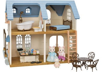 The Courtyard Home Gift set contains a large house with a courtyard and a sky-blue roof. To go along with this wonderful house, this set comes with the Floral Cat father, mother, and baby, all dressed in special clothing. This set includes plenty of furniture and can be enjoyed on its own.