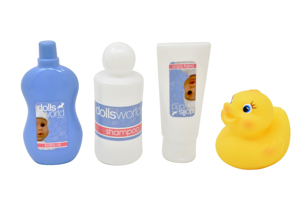Set includes bath, 3 bottles (shampoo, baby lotion, baby oil) and duck, suitable for dolls up to 46cm (18in)
