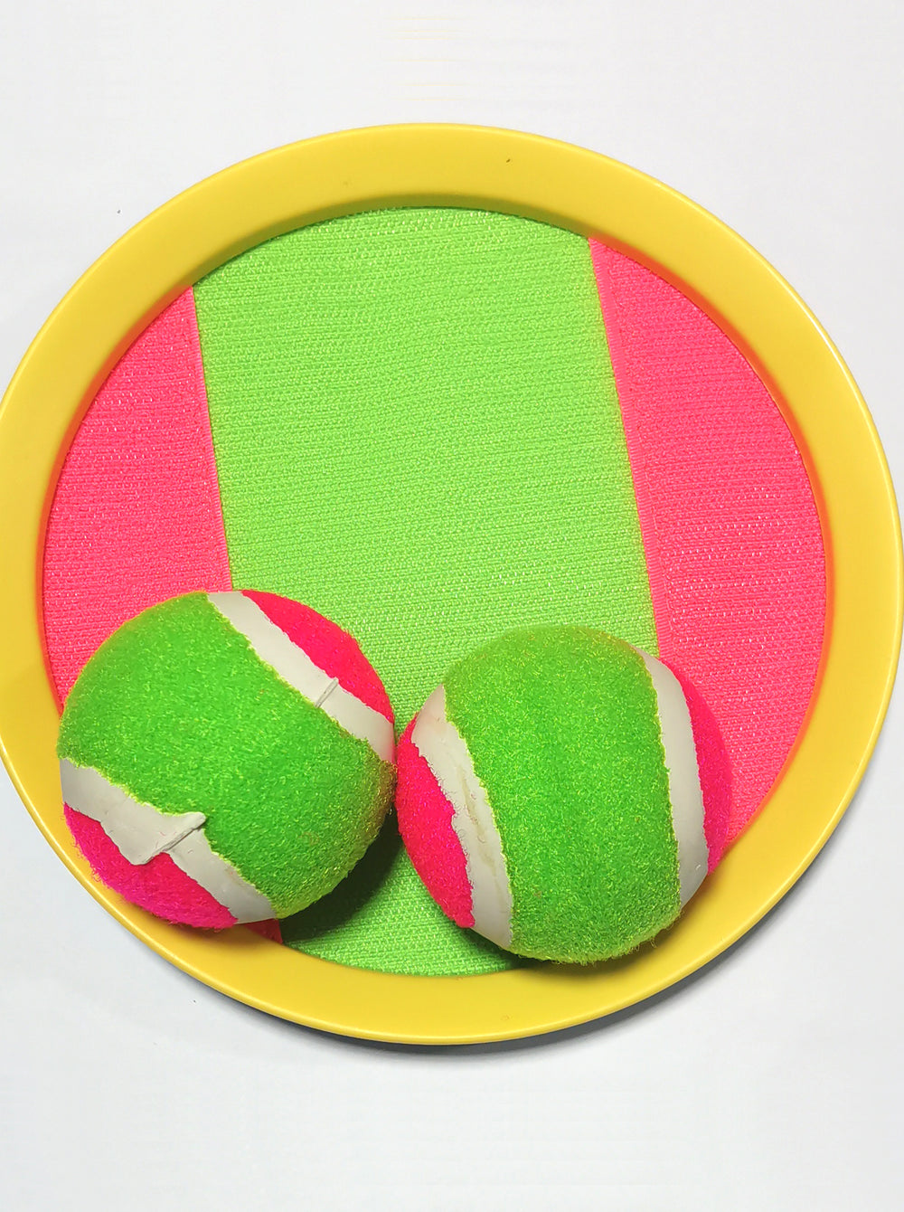 Quality Velcro Catch Balls. Includes 2 velcro mits and 2 balls. 3 ply velcro for stronger grip. Also includes mesh carry bag so you can put everything back in after use. Great for the backyard, parke or beach.